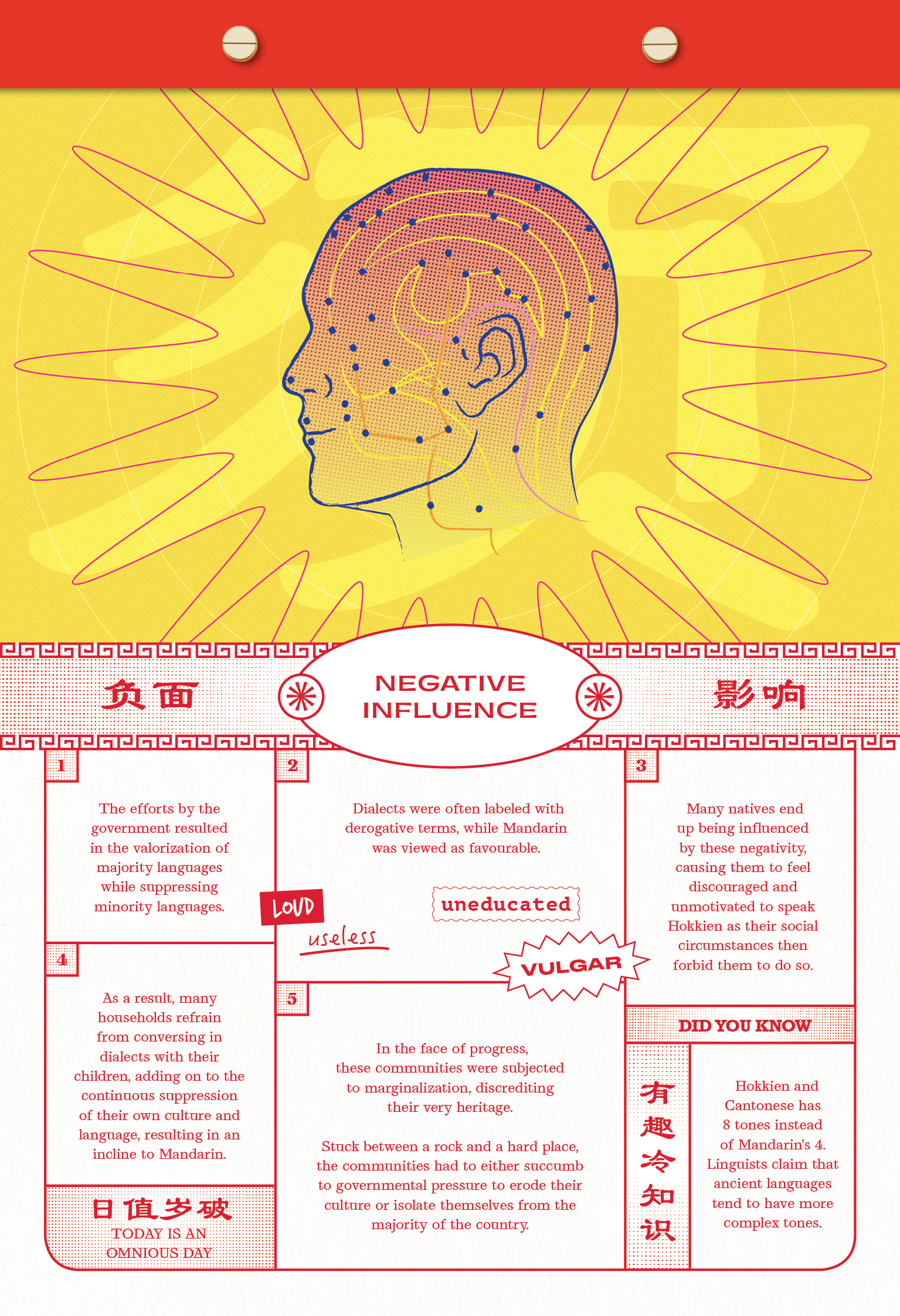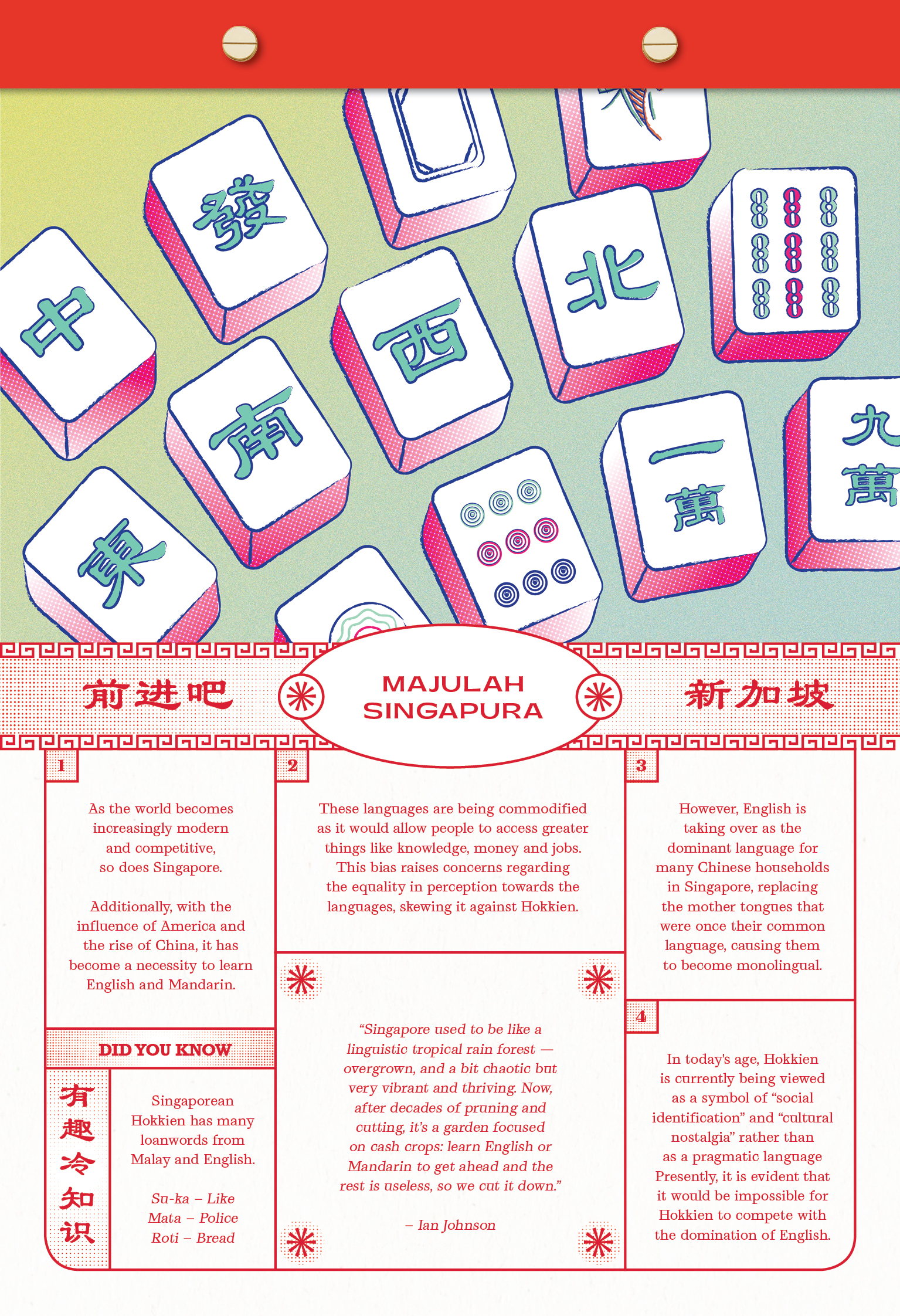 being made in lieu of modern progress and unfortunately, the language policy was one of its biggest casualties. Just a few decades ago, Hokkien was considered the lingua franca of Chinese Singaporeans, but now it is regarded as useless and insignificant in comparison to the rise of English and Mandarin (Bokhorst-Heng and Silver, 2017). While commonplace for the youth of Singapore to be bilingual, many have lost touch with their linguistic roots, causing Hokkien to turn obsolete.